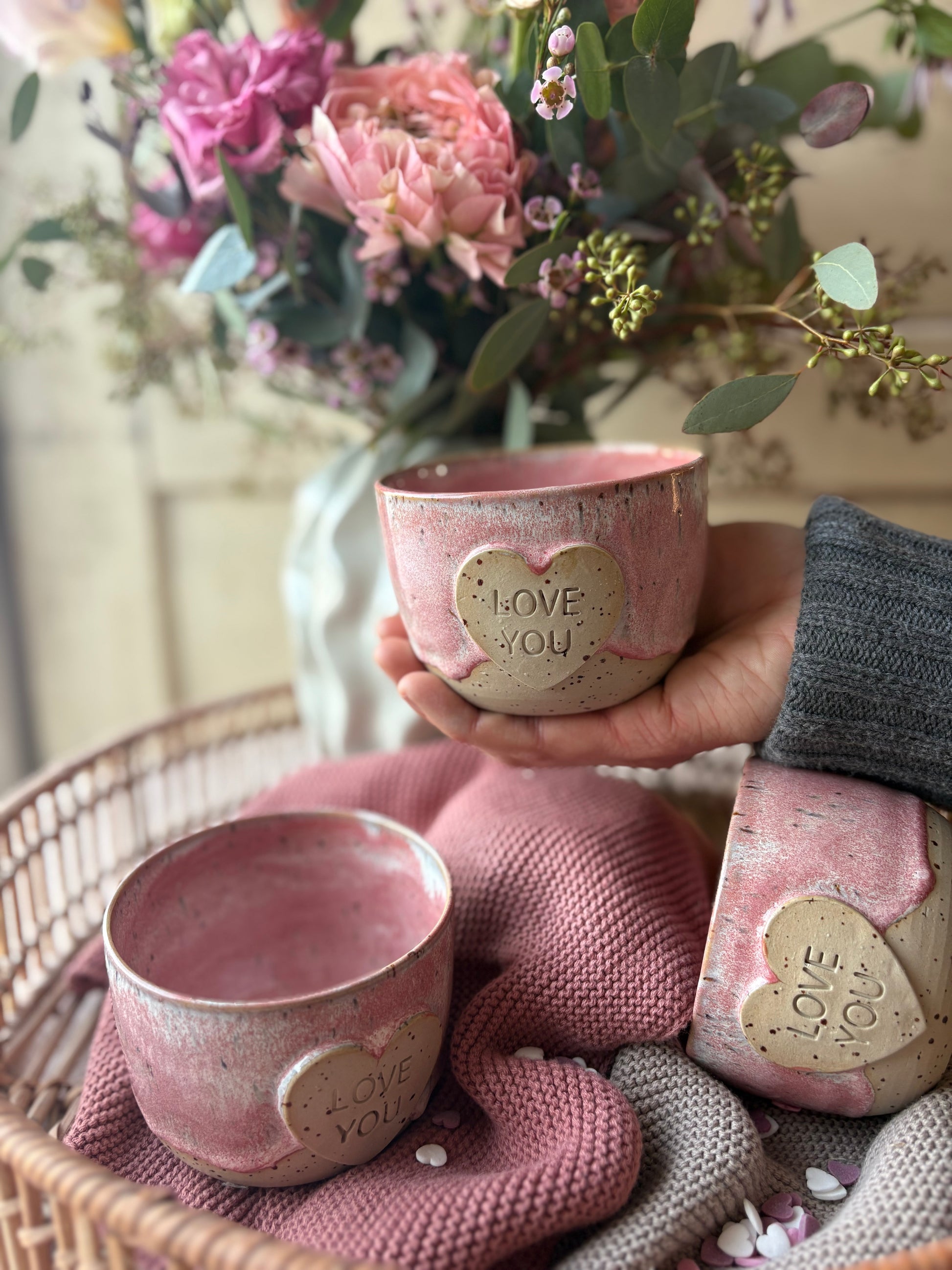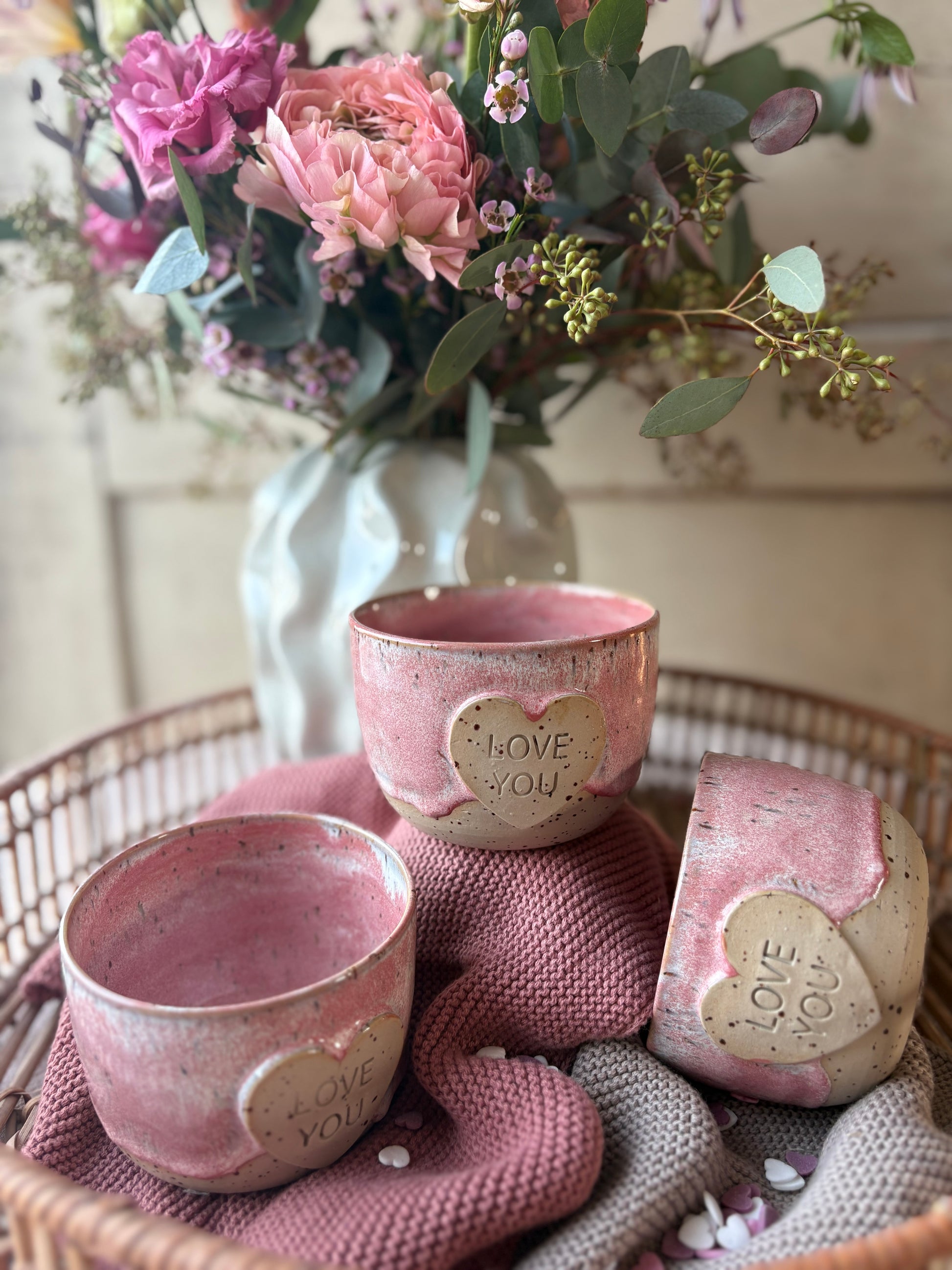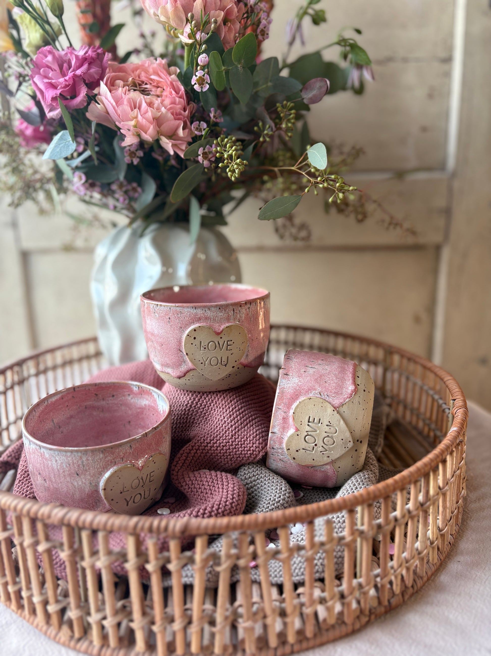 Dieser Becher in zarten Pink- und Weißtönen wurde in liebevoller Handarbeit gefertigt. Der Schriftzug „love you“ macht ihn zu einem besonderen Einzelstück mit persönlichem Charakter. Durch die handwerkliche Herstellung besitzt jeder Becher eine individuelle Struktur und einzigartige Farbverläufe.