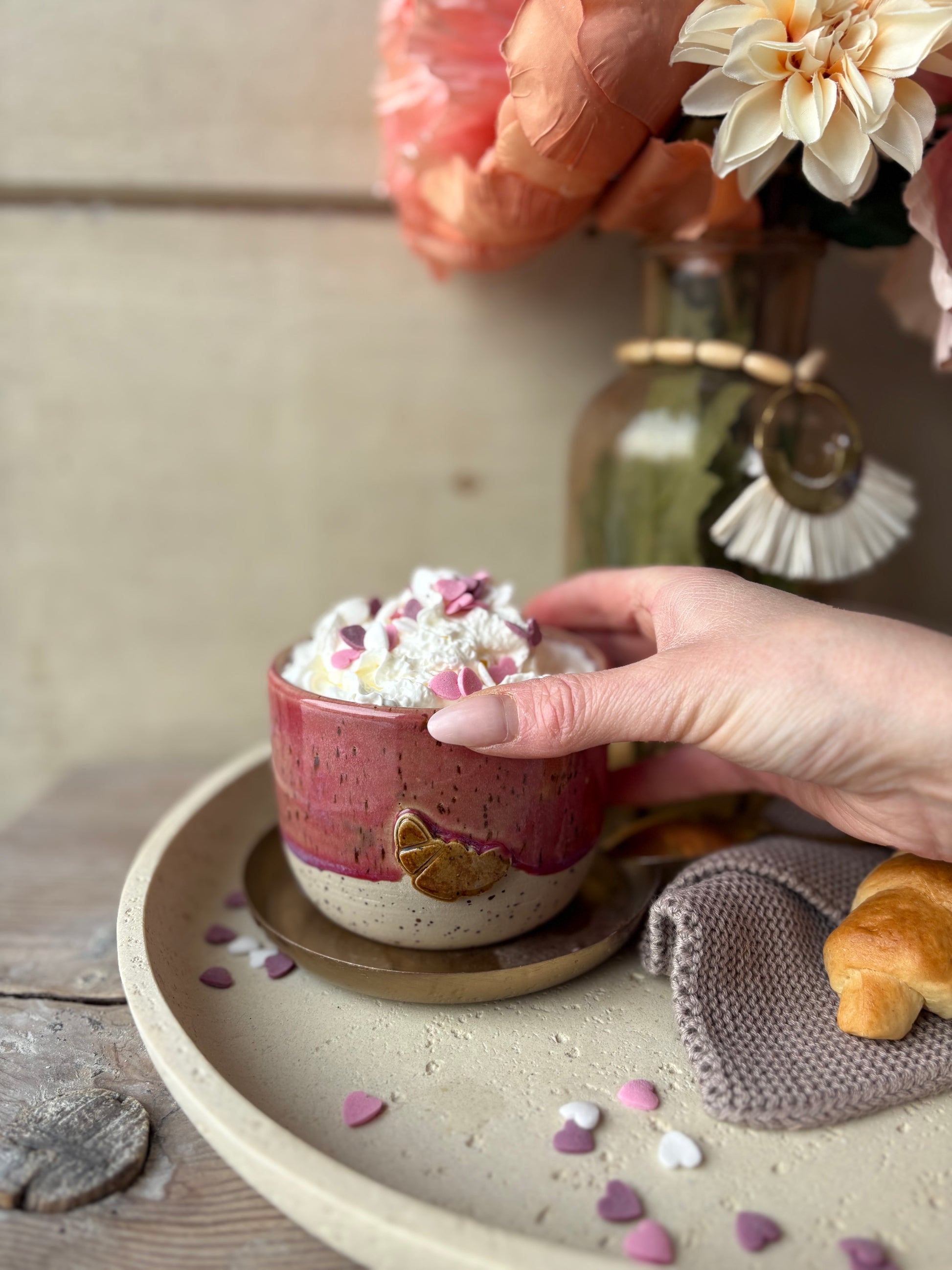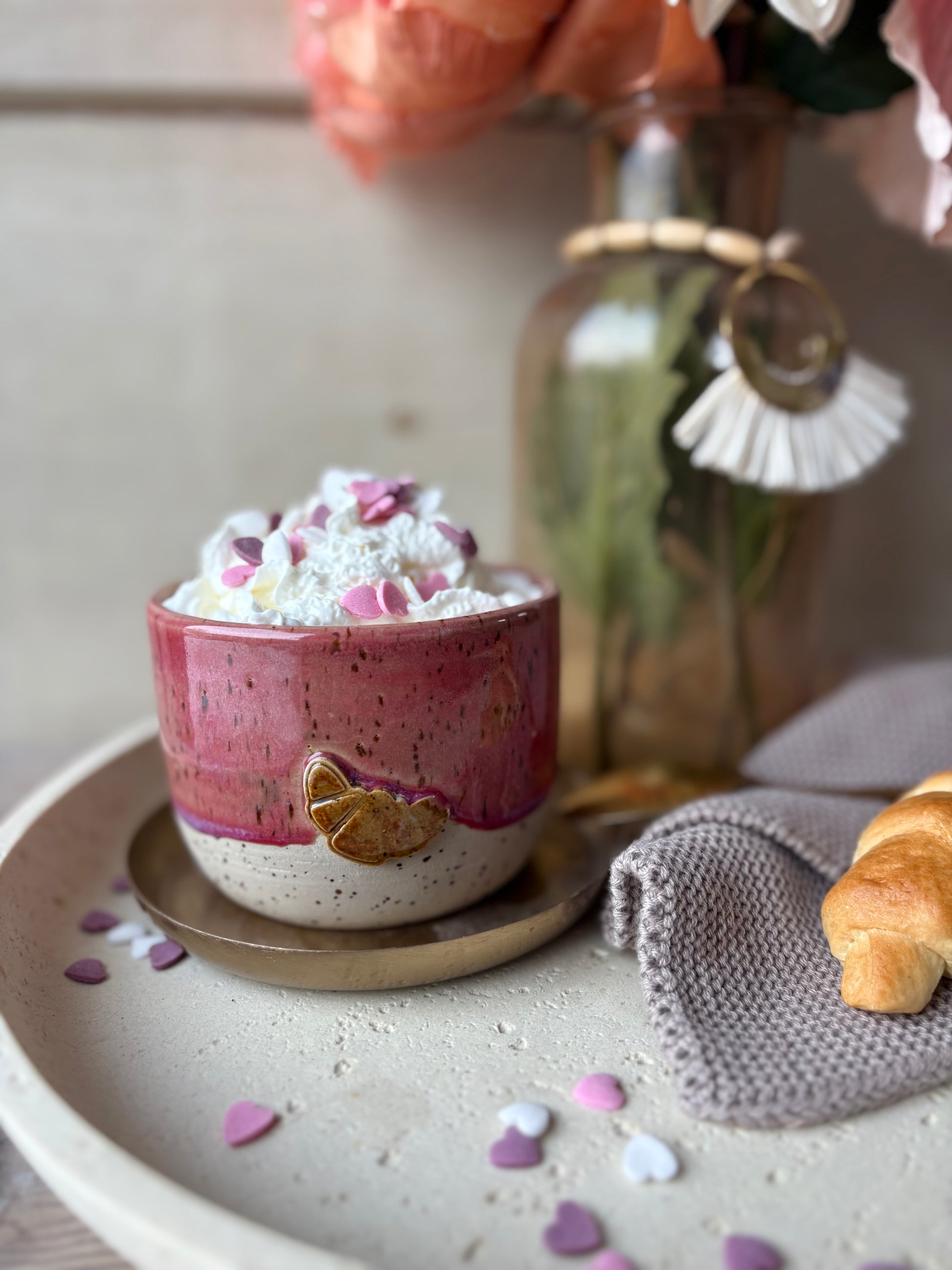 Die sanfte Form und die rosa-weiße Glasur, verziert mit liebevollen Cornetti-Motiven, verleihen dem Becher eine fröhliche, fast italienische Café-Atmosphäre. Die zarten Farbtöne wirken harmonisch und warm und machen jeden Kaffee-, Cappuccino- oder Teemoment zu einer kleinen Genusszeit.